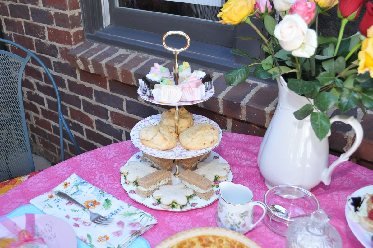The tiered tea tray is the centerpiece of a Tea Party! I made the sandwiches and cut them into flowers and finger size. Chicken and Egg Salad bought from Chicken Salad Chick! Of course, you must have scones! I bought mine from a specialty scones shop near me, The Highland Gourmet. They ship world-wide. I bought my Devonshire Cream from Cost Plus World Market.