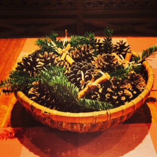 I love to decorate for the holidays, but I like to keep it simple. Whenever possible I use the gifts from Mother Nature. This is a simple and elegant table centerpiece that I use for our kitchen table decoration. I use a natural woven bread basket and fill it with pine cones I picked up in the park across the street, then I added cinnamon sticks and pine branches and, voila! Also~ I use this for a Thanksgiving centerpiece first without the pine branches.